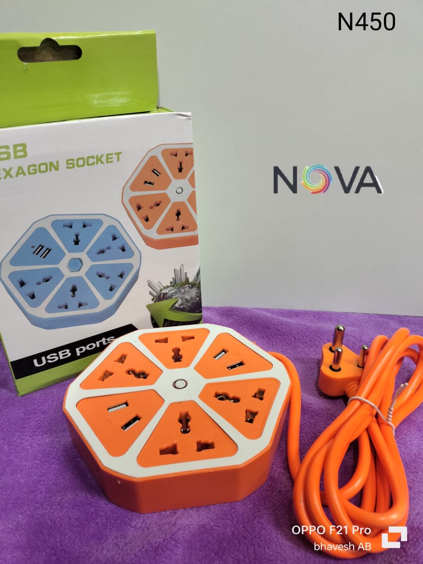 Imported Extension Cord Led Light USB Hexagon Shape Electrical Extension Board with 4 USB Port 1.8 Meter Wire 4 Power Socket Use in Home Travel Office Abs Plastic Protect High Fire Flame (Multicolor) ( pack of 1 )