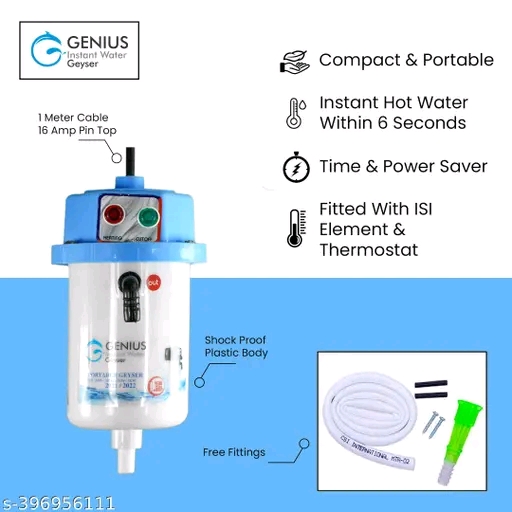 Instant water geyser is compact, very light weight, attractively designed and can easily shifted to any place where hot water required, it is handy to use and just need to be hanged and ready for operation, the best thing is, it does not require additional plumbing, just hang, connect to power and water tap, here is your hot water available, it is a perfect replacement for large size storage water geysers, it provides running hot water directly from the tap without storage. Specifications : Body – polypropylene Plastic Color-Grey, 1 Ltr, ISI PVC pipe and nipple Running hot water within 6 seconds of operation. Only 1 Unit power consumption for 70Litre of hot water Auto power cut-off in case temperature reaches 65 degrees and if the user forgets to switch off. Can be used in bathroom, kitchen, wash area, hotels, hospital , Beauty Parlor, Health Club, Laboratory, Restaurant, Saloon, Clinic, Factory etc. Country of Origin: India Country of Origin: India
