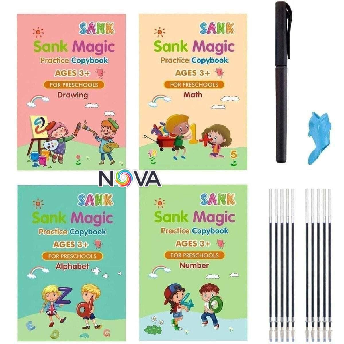 Magic Book for Kids, Sank Magic Practice Copybook, (4 Book+10 Refill+1 Pen+1 Grip) Number Tracing Book for Pre-Schoolers with Pen, Magic Calligraphy Copybook Set Writing Tool for Kids