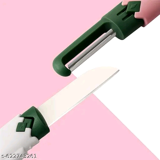 Multipurpose 2 in 1 Kitchen Knife and Peeler Set with Protective Case, a perfect portable fruit and vegetable cutter for everyday use. This stainless steel blade kitchen knife is designed as a 2 in 1 knife and peeler for quick slicing, peeling, and cutting of fruits, vegetables, potatoes, apples, carrots, cucumbers, and more. Its sharp blade ensures effortless precision, while the soft grip handle provides comfort and safety during use.